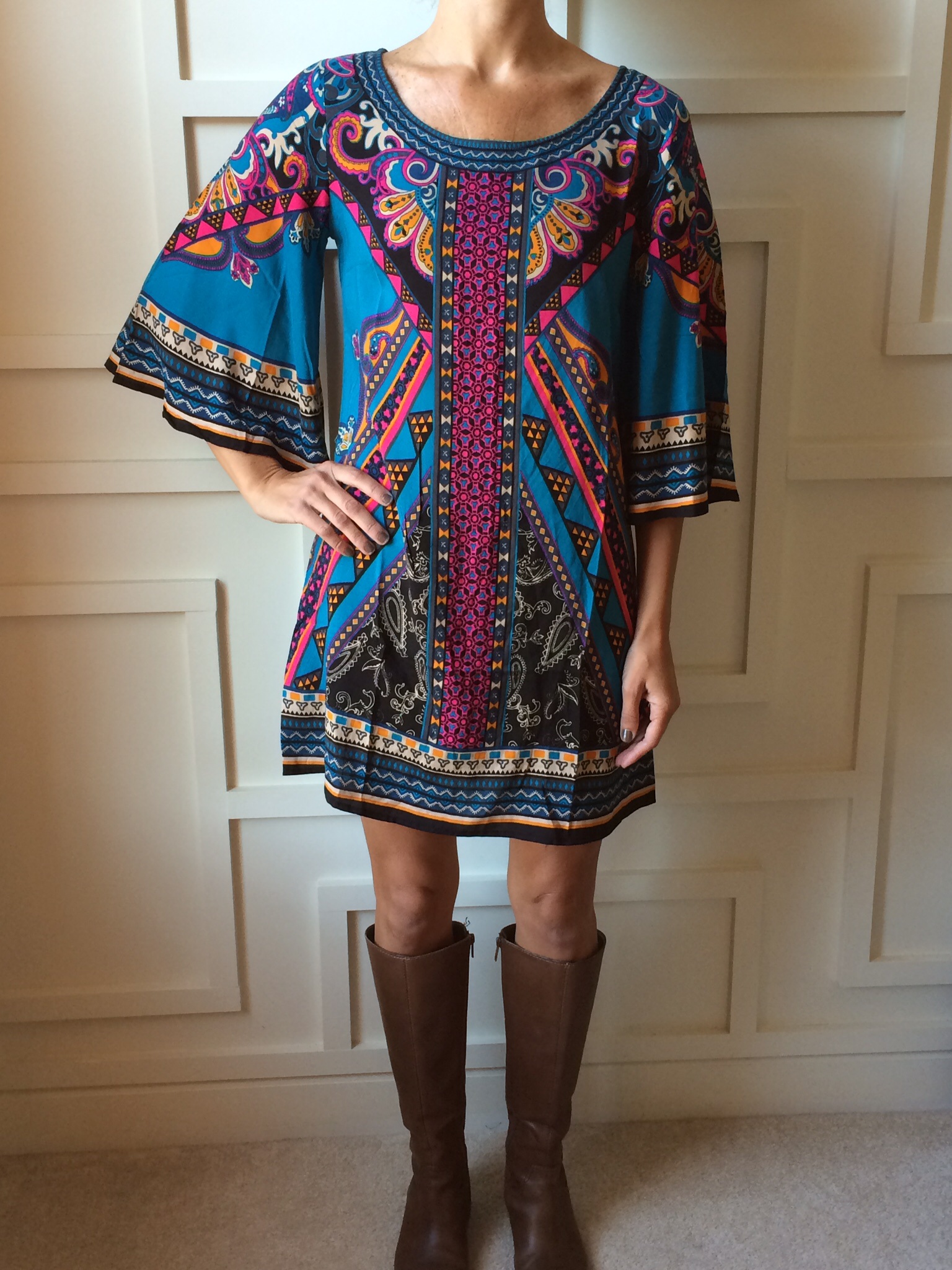 Loving this fun shift dress! It looks amazing with brown knee high boots or cowboy boots! Layer with a jean jacket to complete your look.