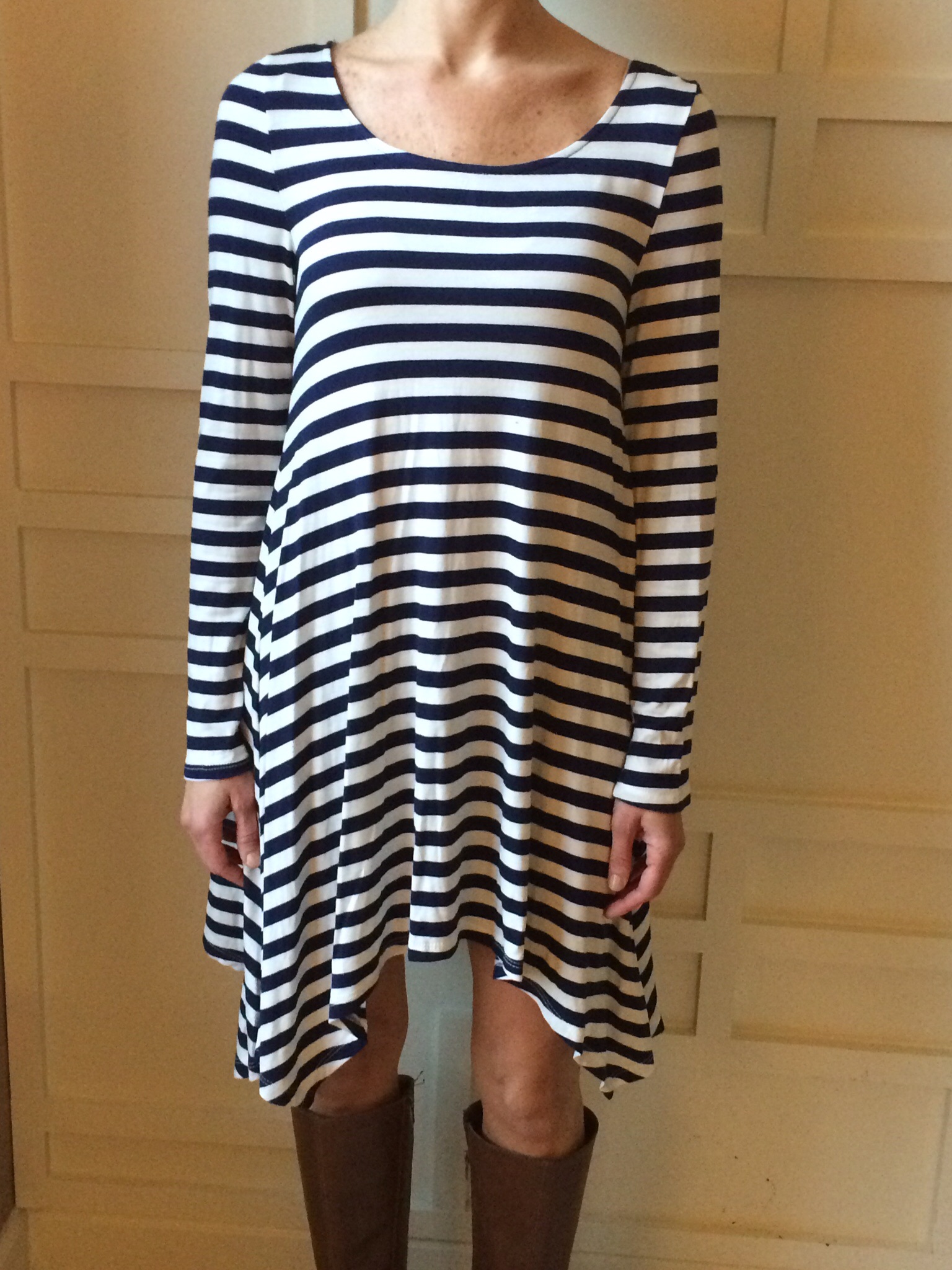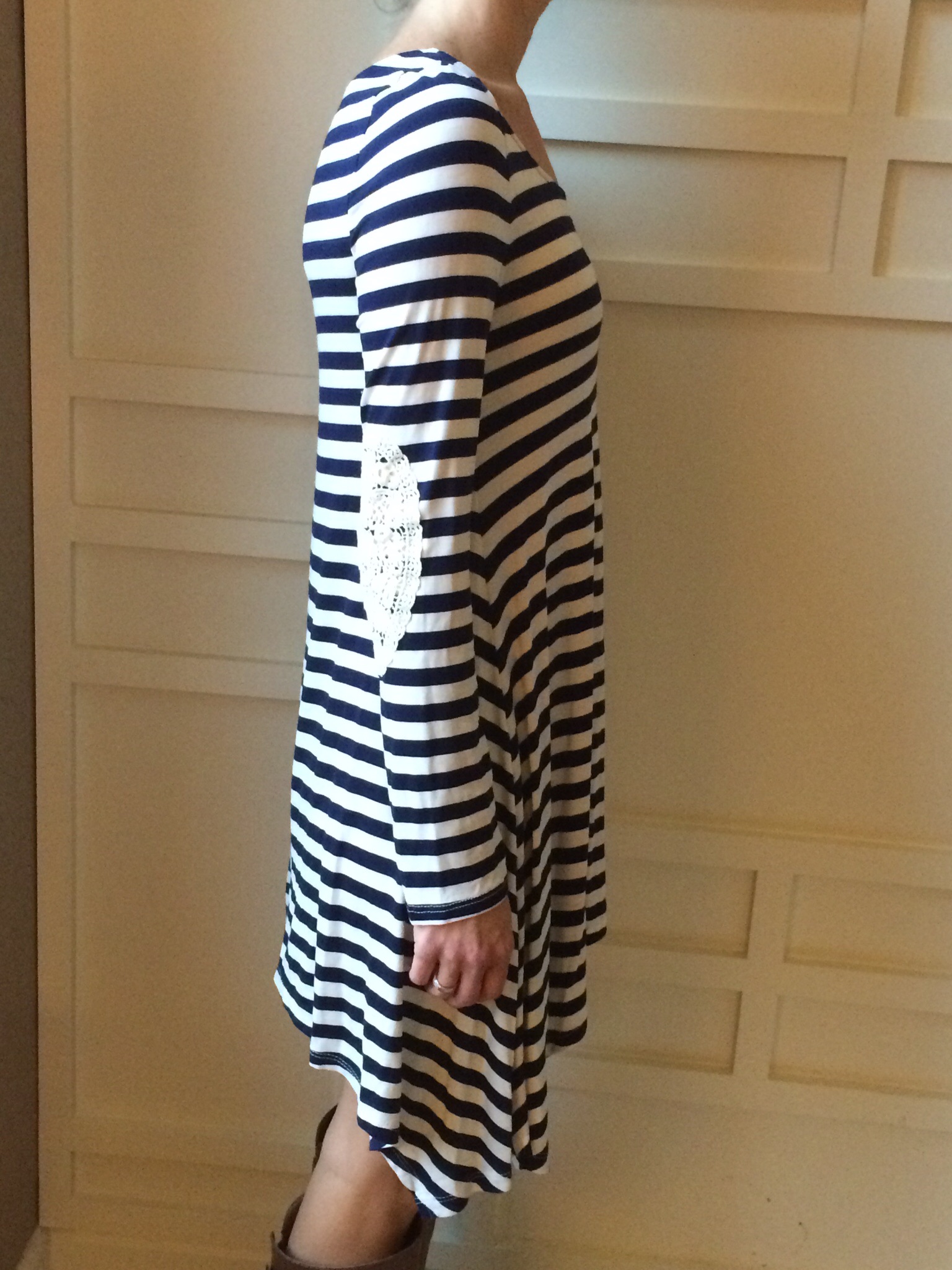 Loving this adorable striped boho dress with lace accent elbow patches. Pair with boots now and sandals as we transition in to spring.