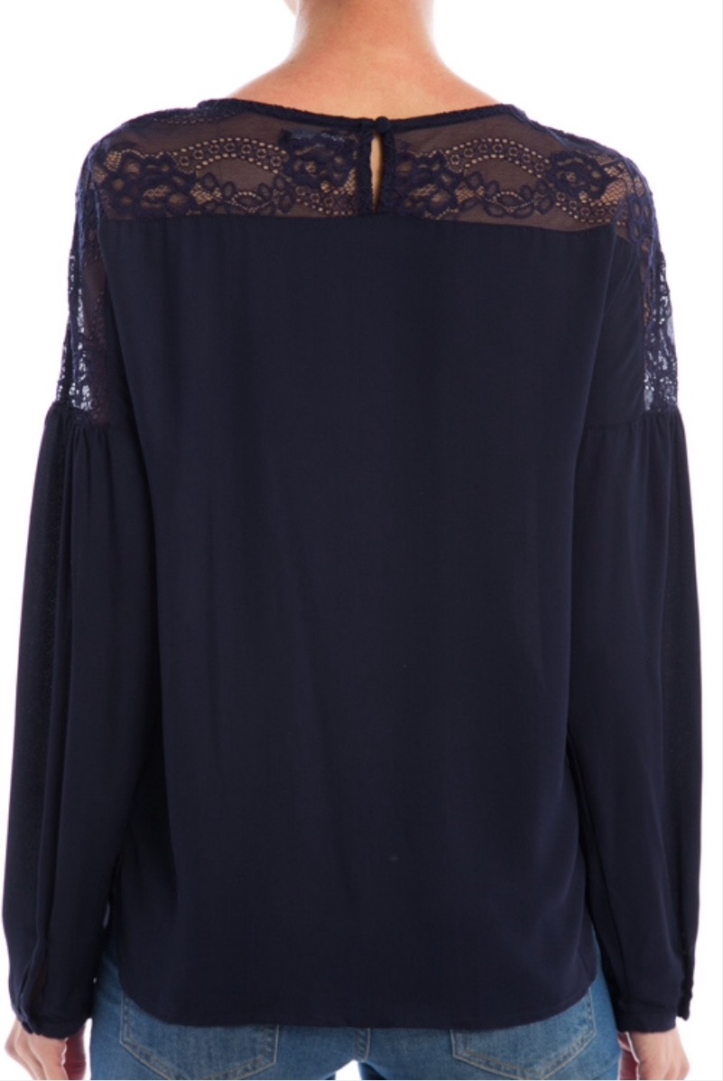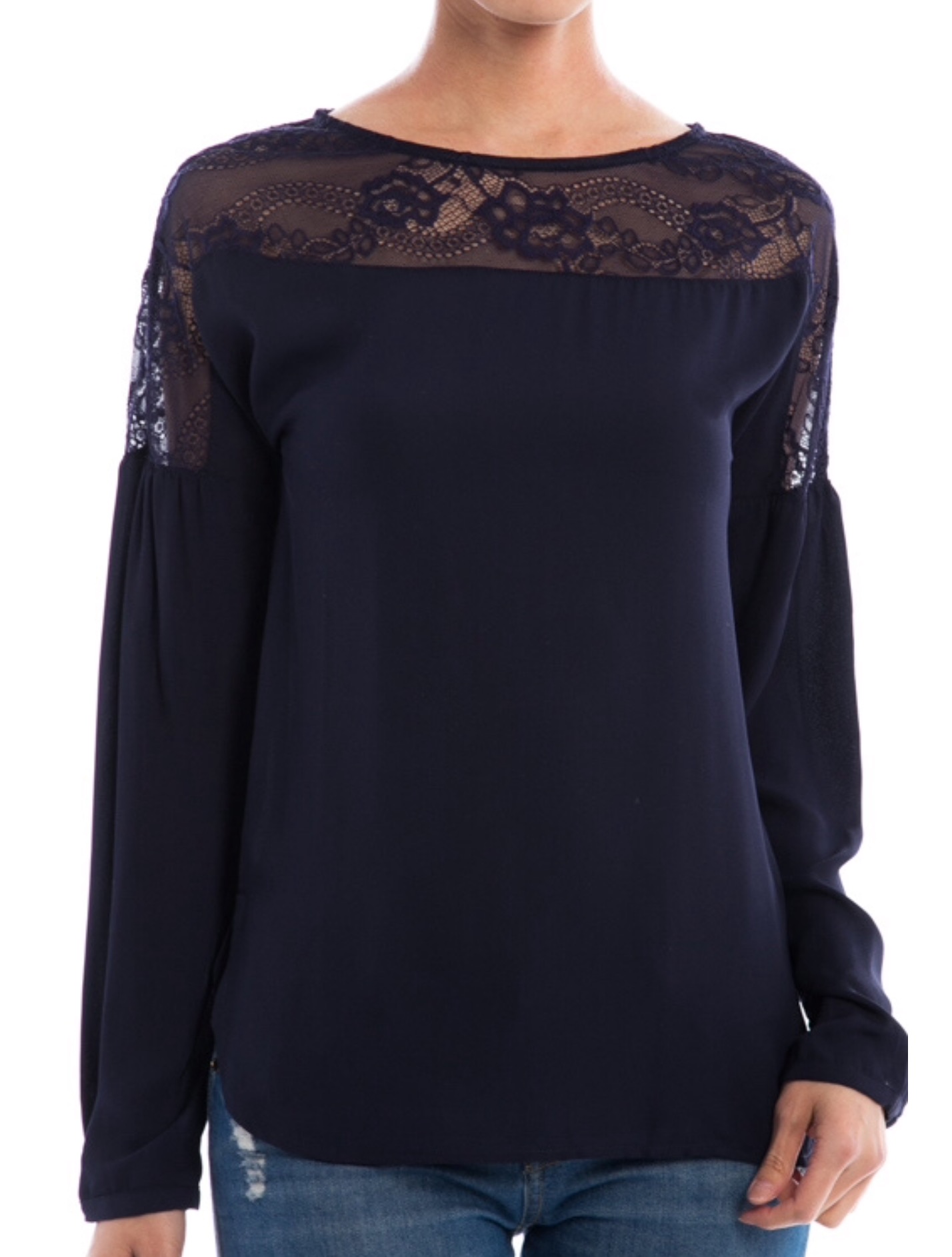 In love with this chiffon top with a solid lace accent panel along the shoulders and neckline!