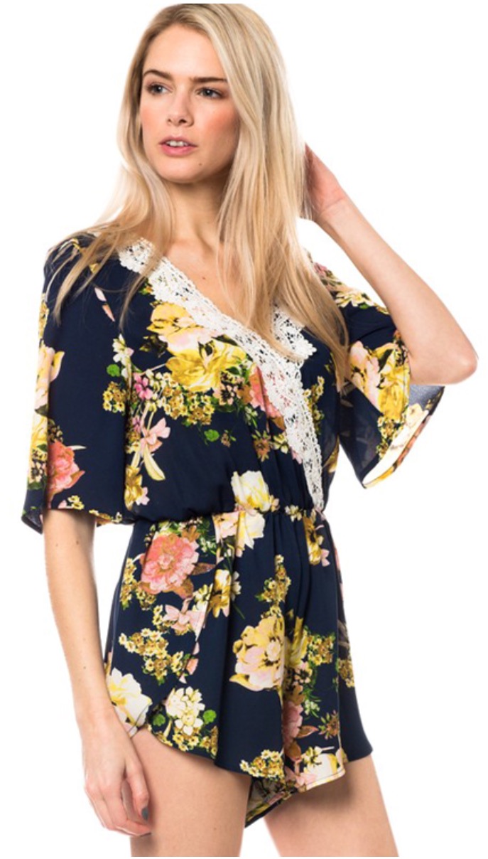 In love with this floral Boho romper. Uber feminine with floral print and crochet accent sleeves. Easy to take from day time to night time any time of the year. *This romper runs small...size up