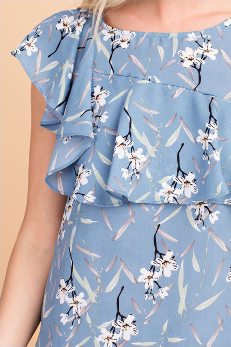 In love with this floral print chiffon top with a ruffle off the shoulder accent.
